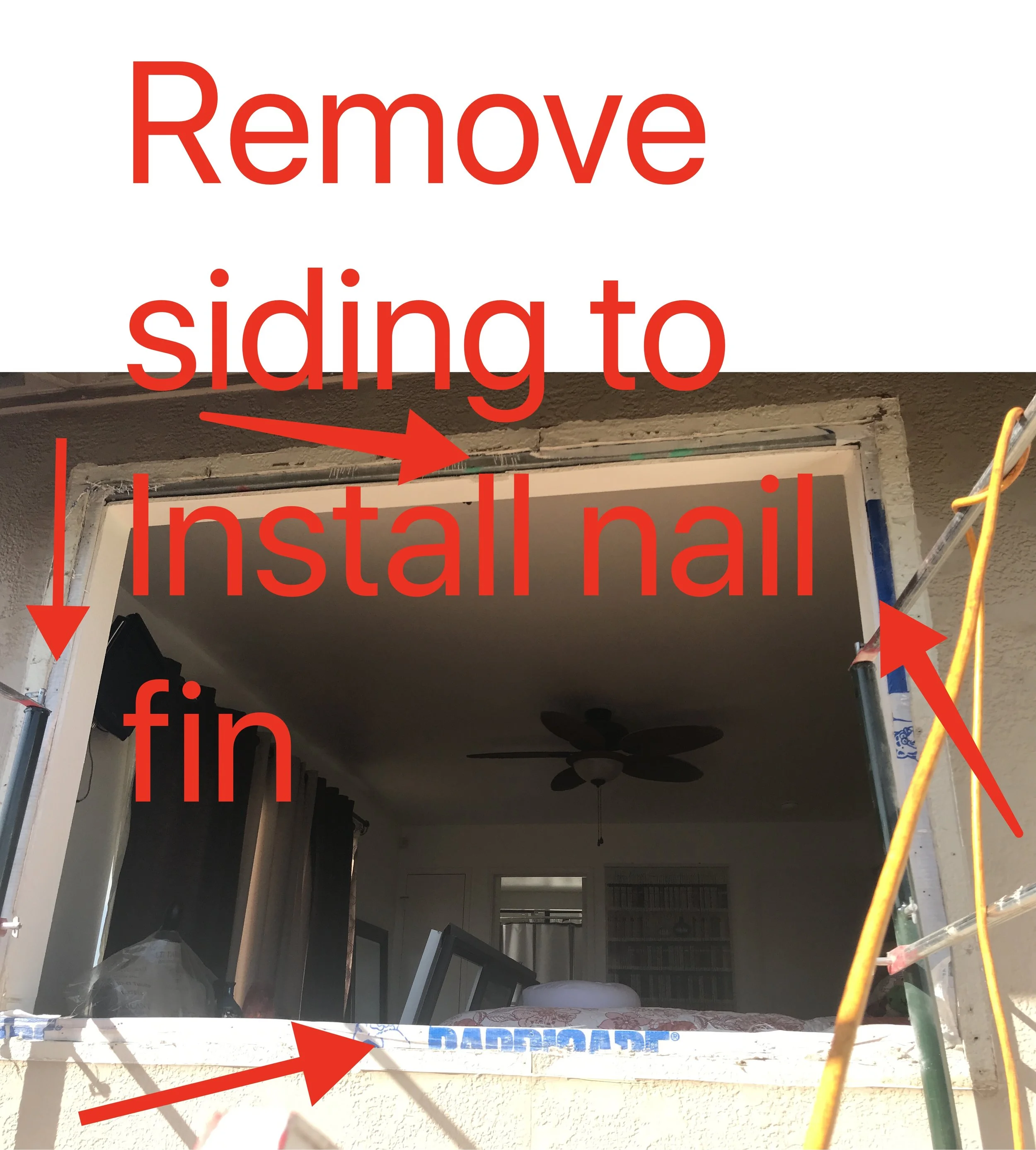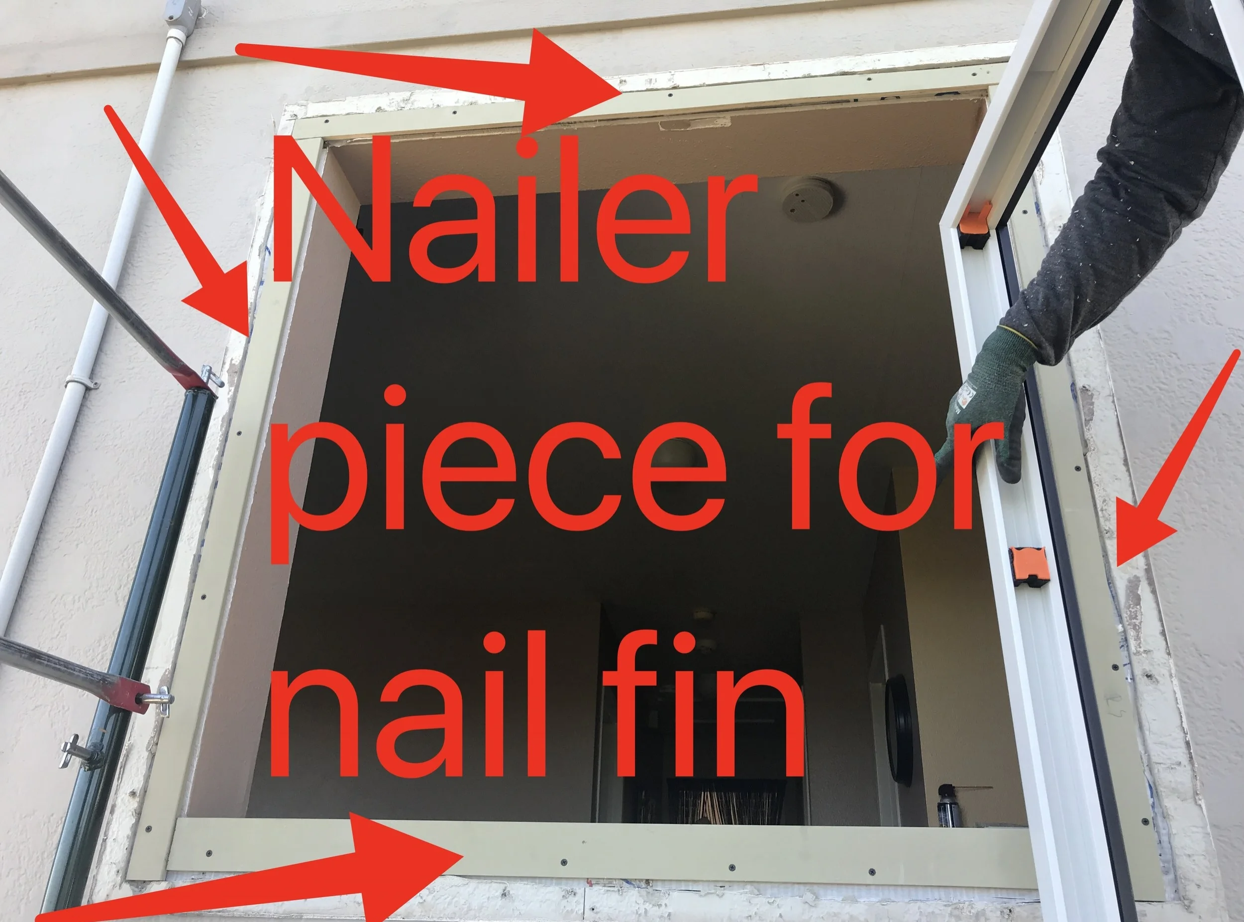 For this job, we added a piece of wood (nailer) to all for sides to be able to secure the nail fin. We could have cut off the nail fin and added wood to make his opening smaller, but the Customer liked the idea of having the nail fins for added protection against water leaks.